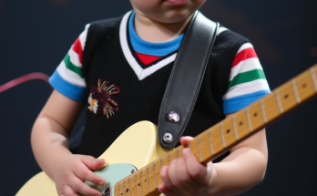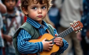 The stage lights cast a golden glow on a young boy, impeccably dressed and brimming with confidence. Guitar in hand, he steps forward, and with a calm, steady strum, begins …